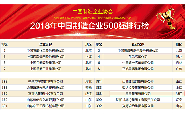 近日,2018年中国制造企业500强暨中国装备制造业100强排行榜发布,永利总站官方网集团名列第388位,较去年的404位进步了16位。