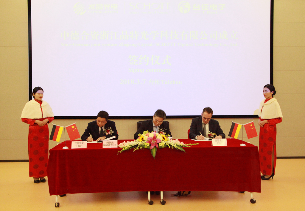 肖特公司拥有130多年的历史,坚持持续创新和优秀产品,不断推动着光学、电子、电器等产业的发展,是一家国际知名企业。水晶光电是台州市的重点骨干企业,自创立以来坚持科技创新,已成长为全球光学领域的领军企业。今天,水晶光电及其子公司台佳电子和肖特公司在这里合资成立晶特光学科技有限公司,共同着力发展AR显示、消费类电子相关半导体封装光学元器件业务,填补国内空白,这将进一步提升水晶光电在光学新产业的核心竞争力,也将加快椒江区工业经济优化升级。